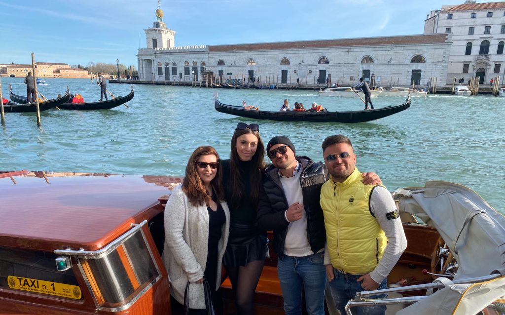 Angie and Henley and our two favorite water taxi drivers, who took us all around Venice including to Burano and Murano during their Paris to Venice 2023 trip